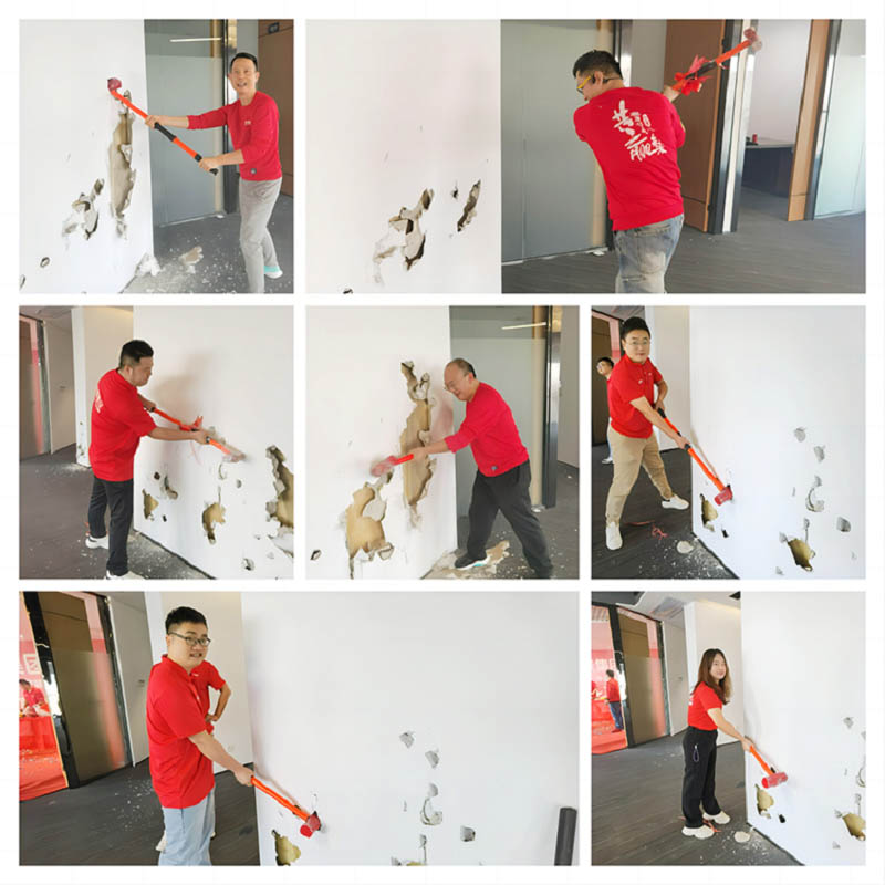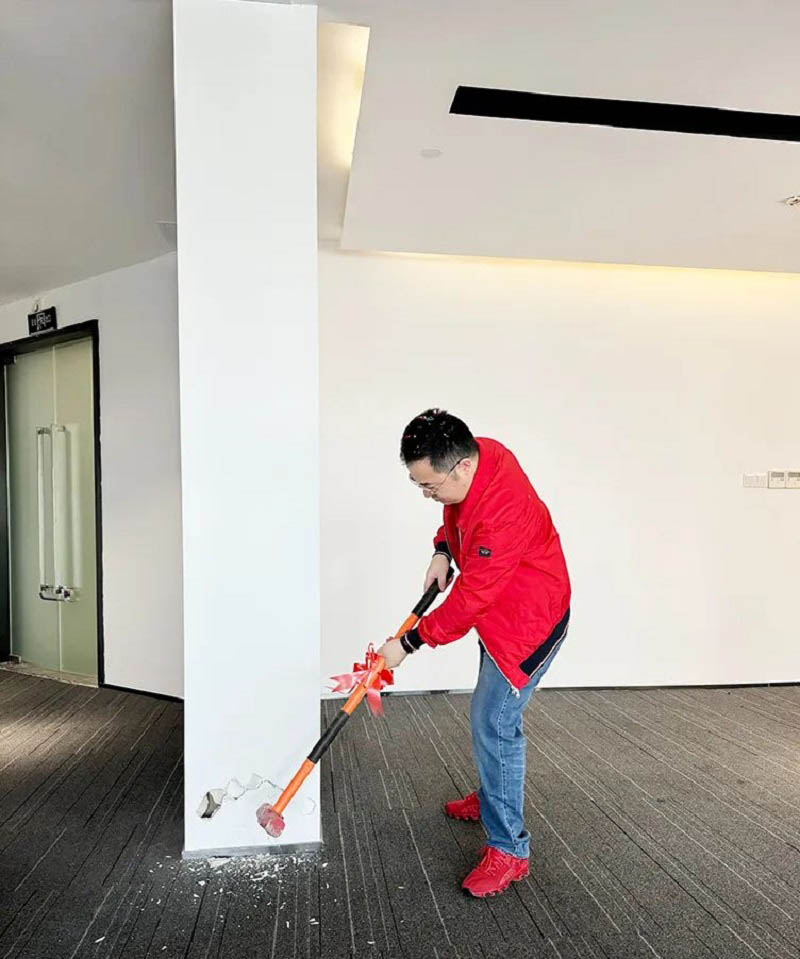 紅桌、紅錘、紅毯,色澤鮮亮紅潤(rùn)的乳豬,紅紅火火!一錘開工大吉,二錘財(cái)源廣進(jìn),三錘萬事如意!伴隨著禮花的綻放,合景人手握禮錘,一同為新辦公區(qū)裝修開工儀式揭開序幕。在熱烈的掌聲中,大家共同慶祝辦公樓裝修工程的正式啟動(dòng)!