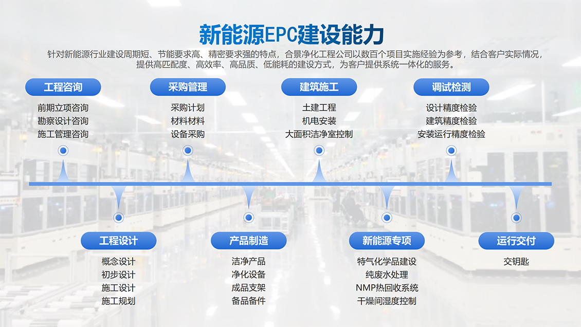 合景智慧建設是工業(yè)高端制造領域生產車間建設高潔凈度和低露點凈化車間內裝工程的規(guī)劃、設計、采購、施工與服務一體化總承包商,多年來,在大型廠房建設方面積累了大量豐富的低凈化車間內裝工程設計和施工經驗,特別是在產能規(guī)劃、公用工程、環(huán)境工程(溫度、低露點、高潔凈度)等領域的制造、工藝流程、節(jié)能環(huán)保等提供完善的系統(tǒng)集成工程建設解決方案。